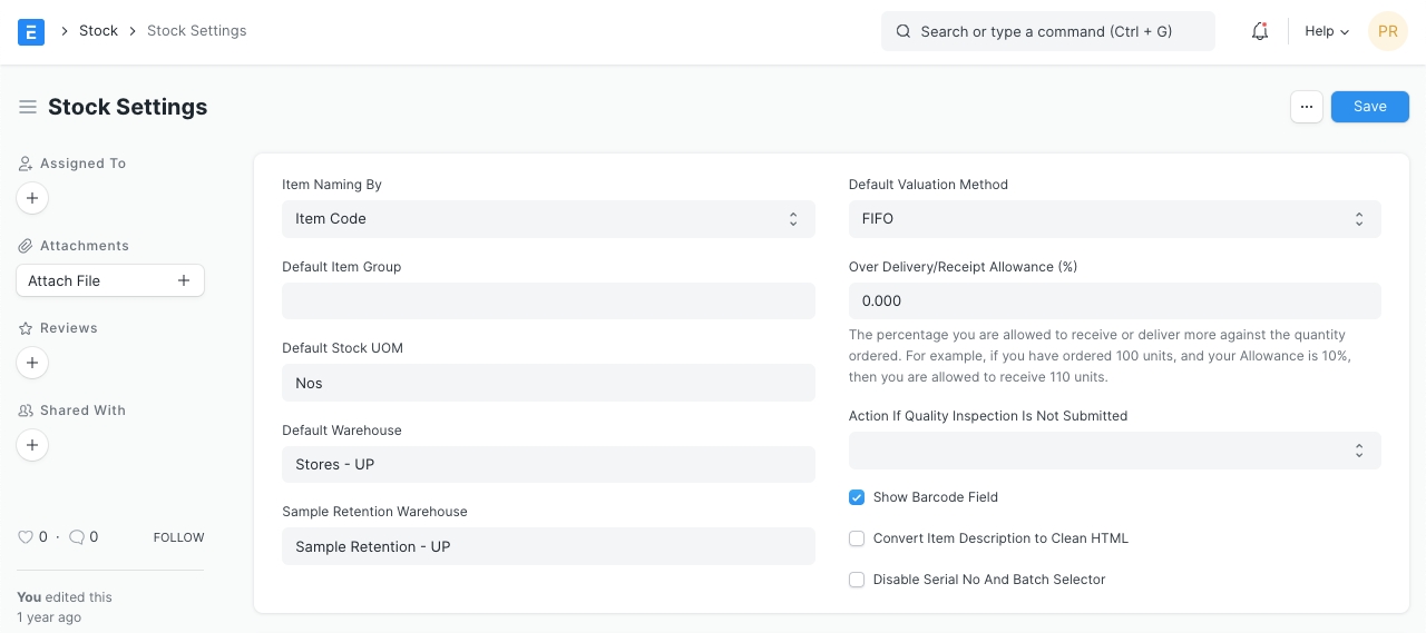 FIFO - first in first out or moving average valuation for your items. The default method is FIFO. If you select Moving Average, new Items will be valuated on Moving Average. You can change this when creating new Items in the Item form. Once the Item is saved, the Valuation Method cannot be changed. Read more here.