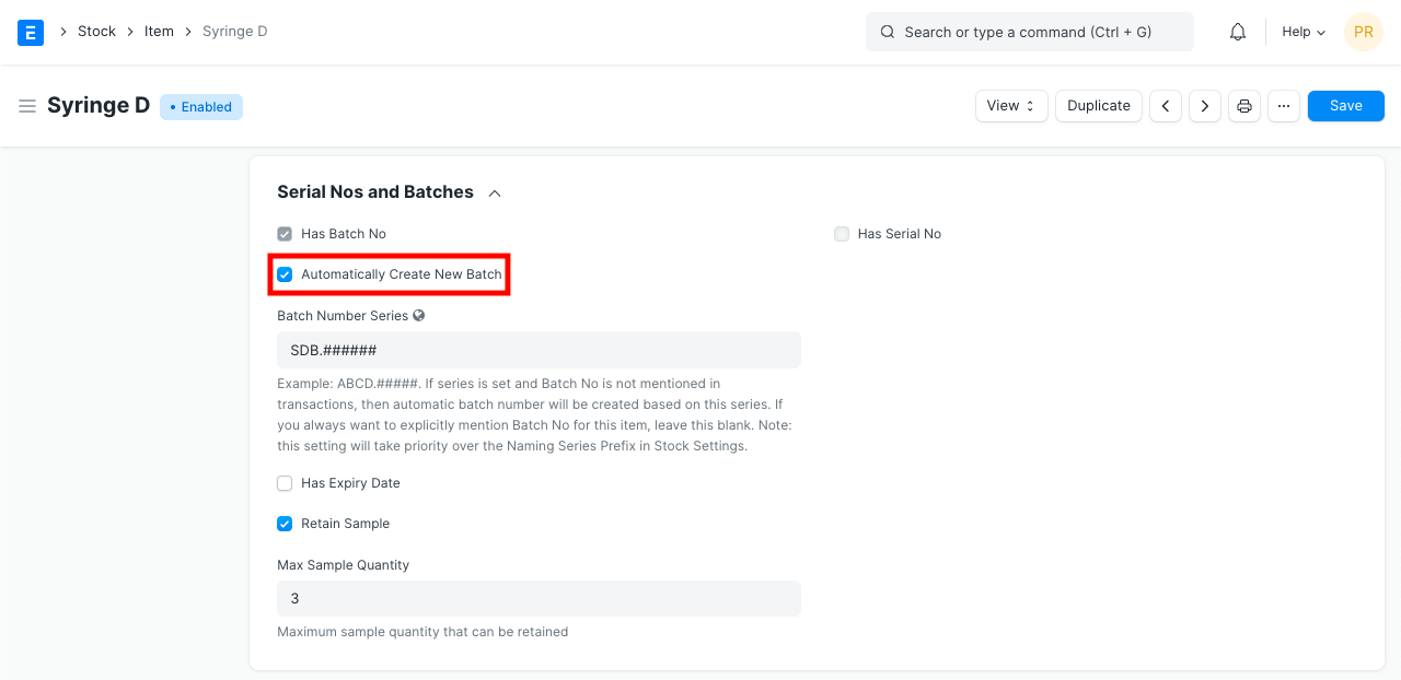 When Batches are enabled for an Item, the option to retain sample stock also becomes available.