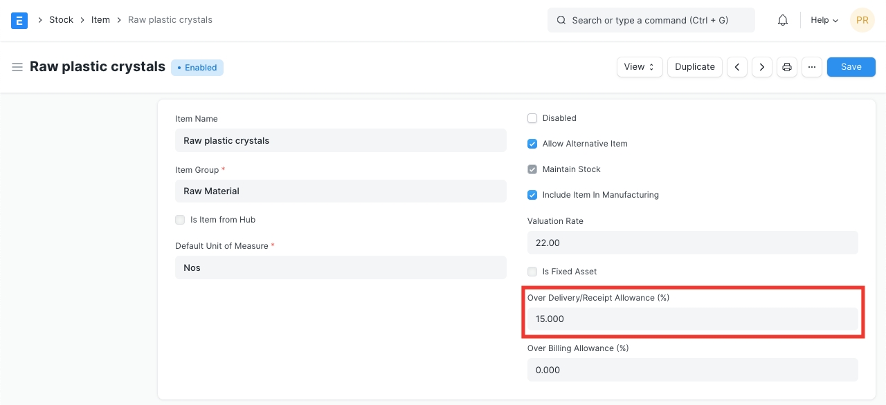 For example, if you have ordered 100 units of an item, and if item's over receipt percent is 50, then you are allowed to make Purchase Receipt for up to 150 units.