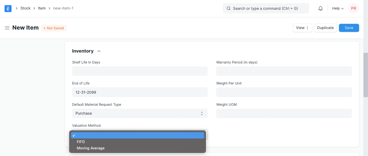 You can also set Valuation Method in the item master, especially when a valuation method for an item is different from the default Method as seen in the following screenshot.