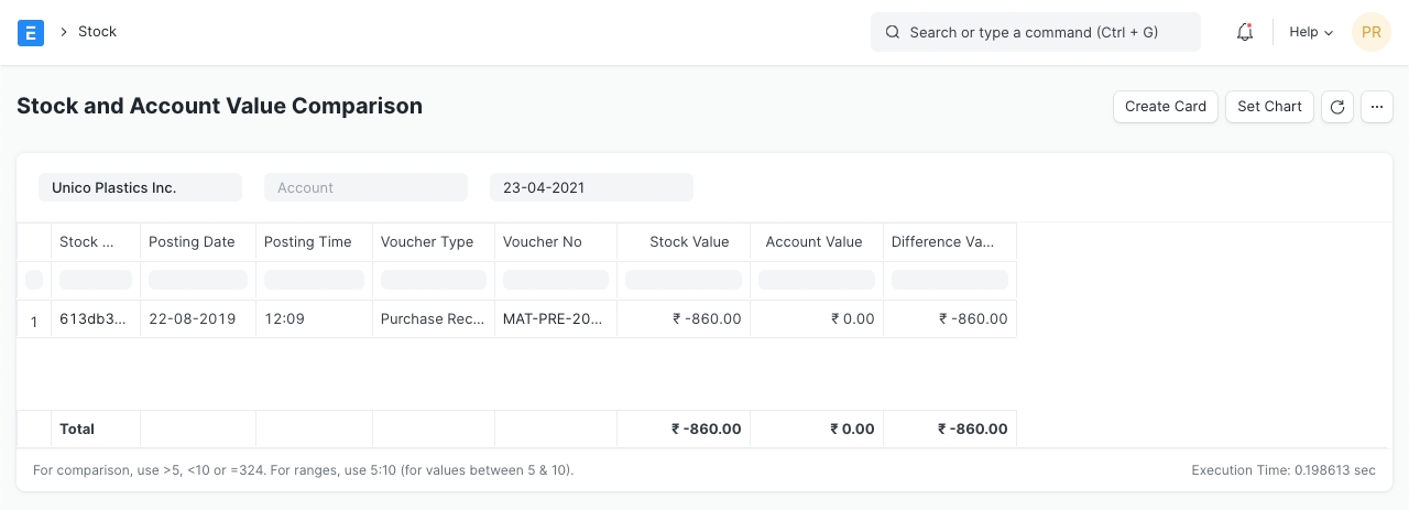 This report helps the user to understand the difference value between the stock account and stock balance report. At the end of the financial year, every organization has to match its closing stock balance with the closing stock account. Sometimes they do not match due to some issues. In that case, users can view the "Stock Value and Account Value Comparison" report to understand the incorrect transactions. Then, users can make adjustments entries accordingly.