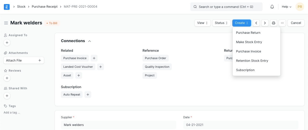 Once you've received a Purchase Order using a Purchase Receipt, you can create a return entry in case the Item needs to be returned to the Supplier. To know more, visit the Purchase Return page.