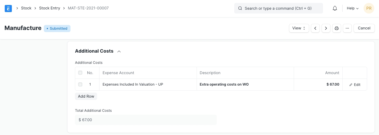 If the perpetual inventory system is enabled, additional costs will be booked in Expense Account mentioned in the Additional Costs table .